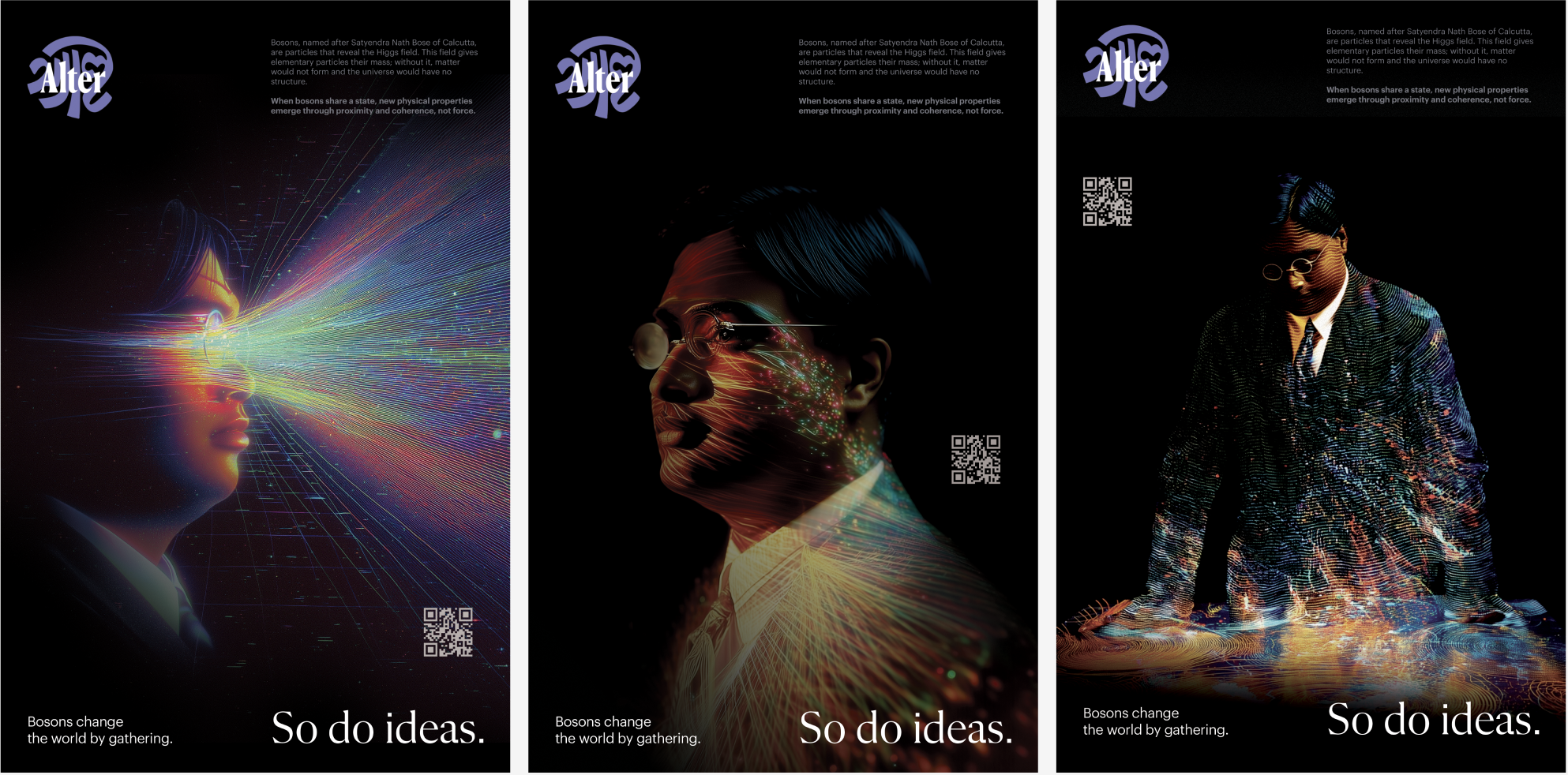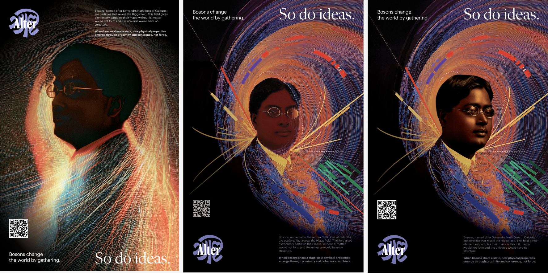 The visual problem was precise: represent Bose, represent the physics of bosons, and hold a register that acknowledges the historical weight of the man without placing him in the past tense.