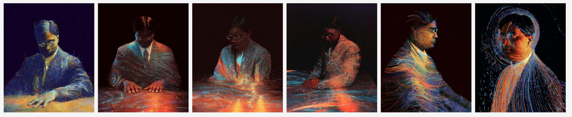 In the version that held, Bose sits forward in a posture of concentration. Through his figure, the light streams move in overlapping regions of colour whose interference is the visual argument. The concentric circles run across his form, giving the image its structural coherence that is our style. The background is deep black: the register of the image is the register of physics at its most fundamental, which happens in conditions of near-total darkness, and is made legible only through the signals that emerge from it.