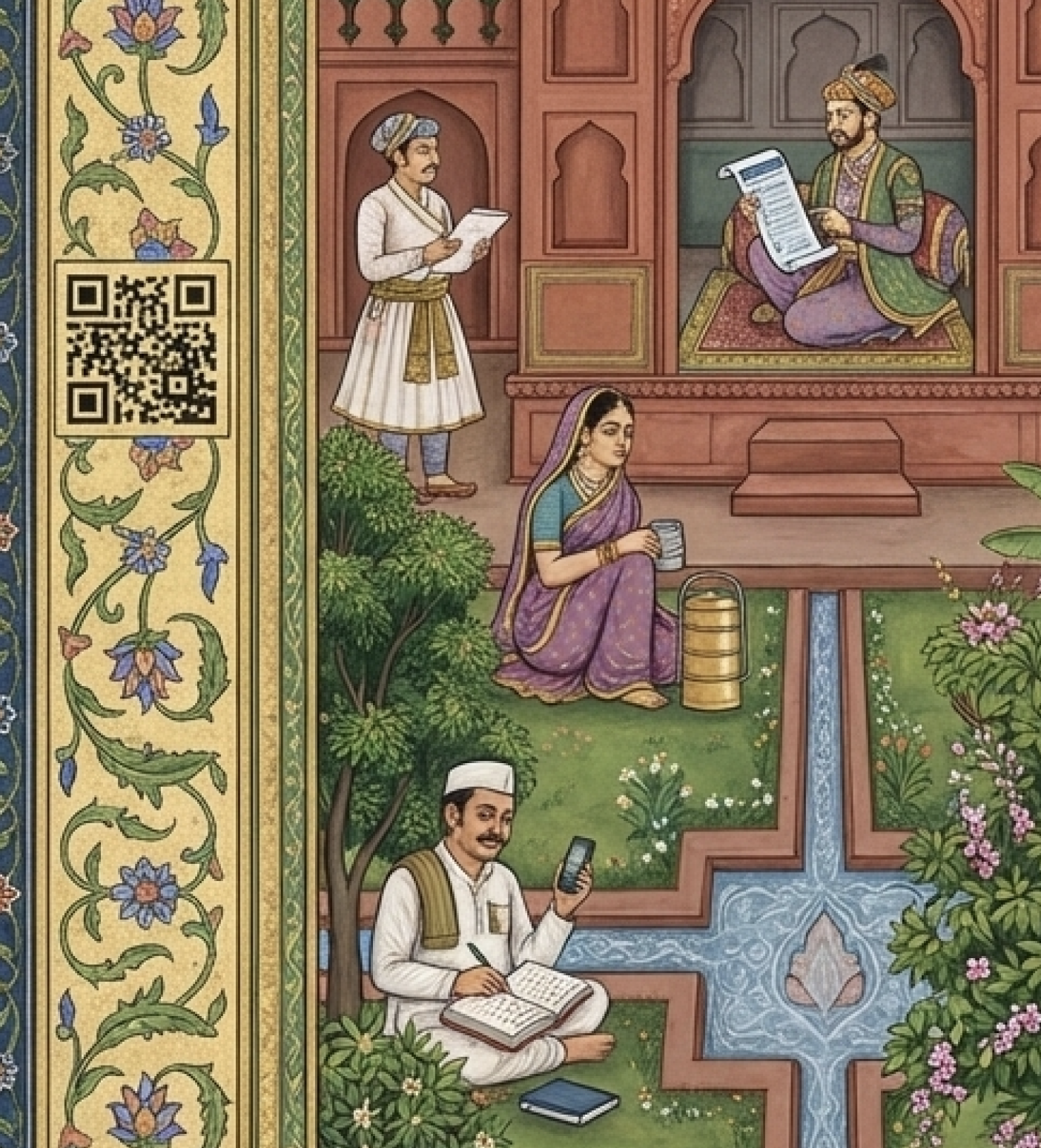 Option 1: The India Tech Stack as a Miniature Painting– Aadhaar, UPI, DigiLocker as the visual subject was the most obvious choice. The IMF, in its June 2025 report, declared UPI the world's largest retail fast-payment system by transaction volume. UPI recorded 129.3 billion transactions, 49% of global real-time digital transaction volumes. These systems are transformative, and the UPI is a fantastic testament to progress in India — indigenously developed, globally renowned.